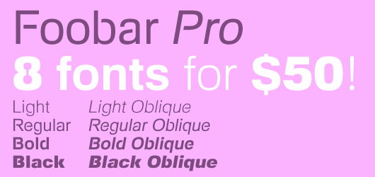 Foobar Pro Family is a professionally reworked font that contains an extended character set for setting text in 65 languages requiring more than the basic A-Z!